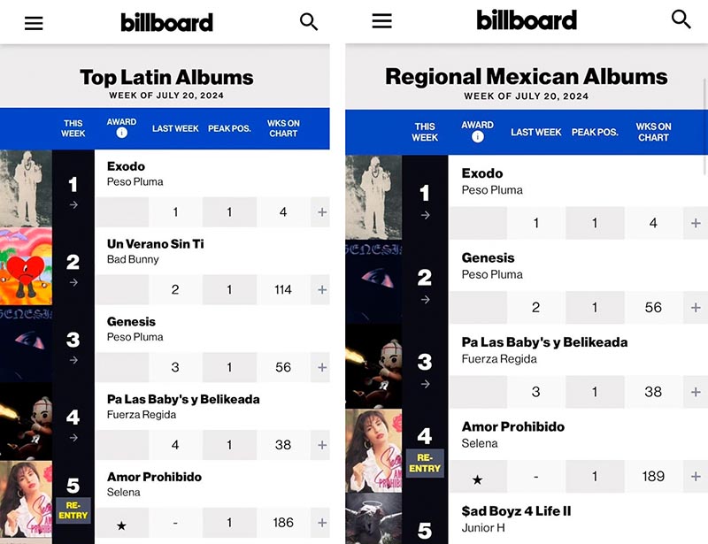 A principios de este año, se lanzó una versión «remasterizada» del 30º aniversario del emblemático álbum de Selena ‘Amor Prohibido’, la cual ocupó los primeros puestos de las listas de éxitos y hoy, debuta en el Top 5 de la lista Top Latin Albums & Regional Mexican Albums de Billboard. Estas noticias llegan tras de lanzar ‘Amor Prohibido’ en formato vinilo por primera vez. Simultáneamente, el álbum ‘Ones’ de Selena también se sitúa en el Top 5 de la lista Latin Pop Albums de Billboard. Así mismo, ‘Amor Prohibido’ hizo historia al convertirse en el primer álbum tejano en alcanzar el número 1 en la lista Top Latin Album Chart de Billboard. Este logro le regaló a Selena el reconocimiento de convertirse en la segunda artista latina de la historia en encabezar la lista y, al mismo tiempo, fue la primera artista latina de la historia en lograr una grabación «non-crossover» en la lista Billboard 200.