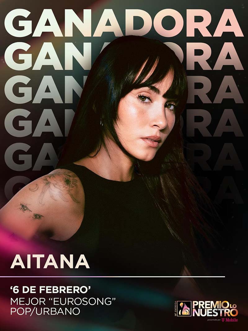 La sensación del pop español AITANA se llevó el premio a la «Mejor Canción Euro Pop/Urbana» en la 38.ª edición de los Premios Lo Nuestro, transmitidos en directo desde el Kaseya Center de Miami por Univision y en streaming para toda Latinoamérica por ViX, por su éxito mundial «6 de febrero».