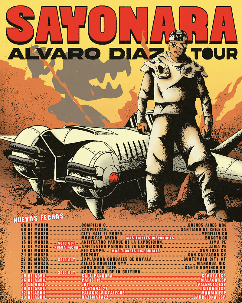 Tras un 2024 tremendamente exitoso, la estrella del rap puertorriqueño, Álvaro Díaz, se prepara a llevar a cabo la gira de su segundo álbum aclamado por la crítica, ‘SAYONARA’. La primera parte de la gira arranca en Buenos Aires, Argentina el 6 de marzo y hará 12 paradas en 10 países. Su gira por Latinoamérica es seguida con una gira por España que arranca el 15 de abril y cuenta con 6 paradas incluyendo Sevilla, Málaga, Valencia, Bilbao, Madrid y Barcelona.