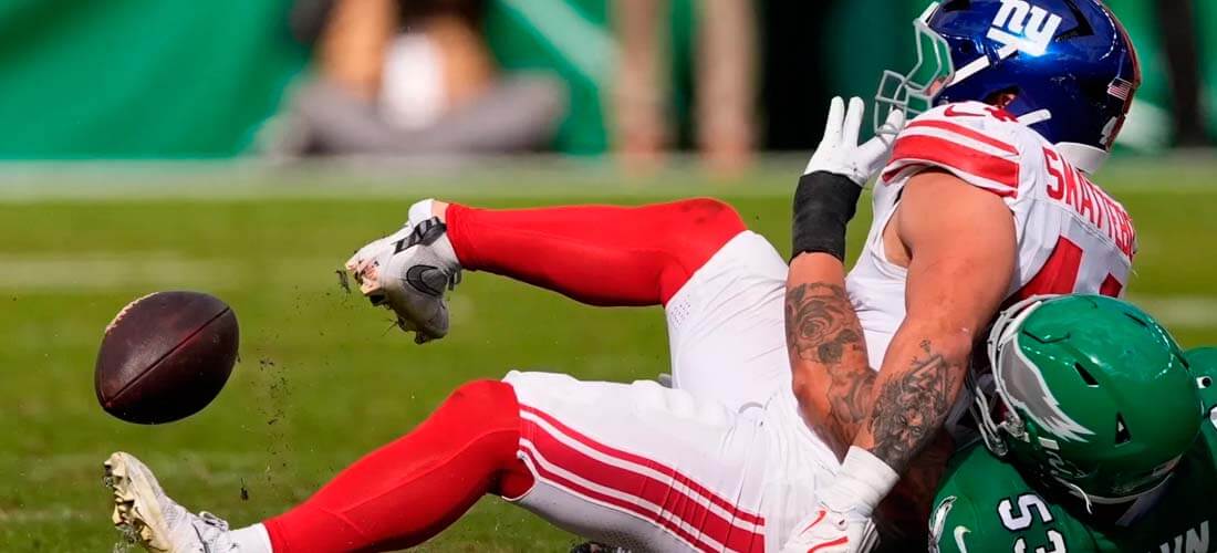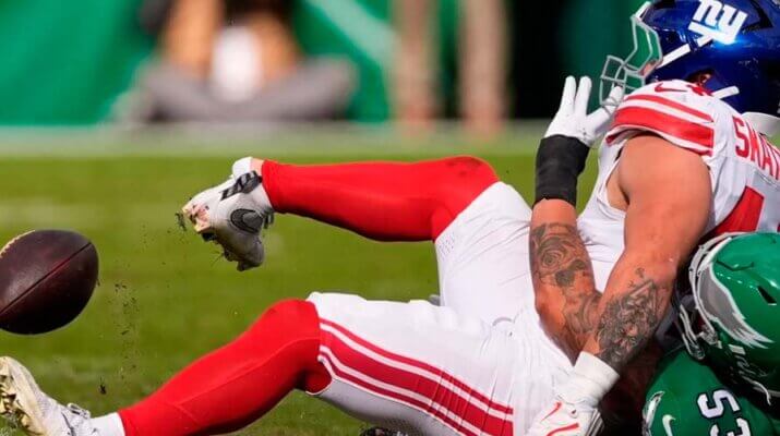 Durante el segundo cuarto del partido entre los New York Giants y los Philadelphia Eagles, en el Lincoln Financial Field de Filadelfia, Skattebo corrió, recibió el balón y fue derribado por un defensor de los Eagles.