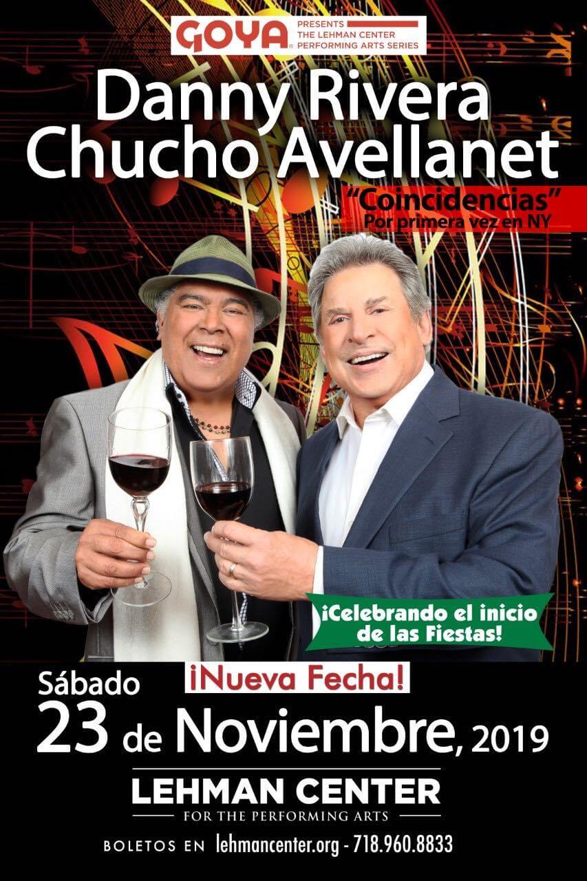 El concierto de Danny Rivera y Chucho Avellanet «Coincidencias» se presenta por primera vez en The Lehman Center for the Performing Arts en Nueva York el sábado, 23 de noviembre. Los boletos ya están en venta a través de www. lehmancenter.org o llamando al 718-960-8833.