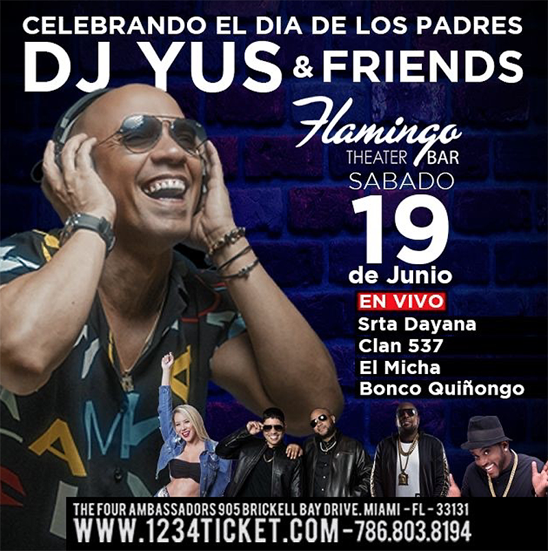 El 19 de junio se presenta Dj Yus en vivo para celebrar el día de los padres en el Flamingo Theater Bar. Junto a alguno de sus mejores amigos de la industria, disfrutaran una noche de música buena y comedia. La Srta. Dayana, Clan 537, El Micha y Bonco Quiñongo dirán presente para este histórico evento.