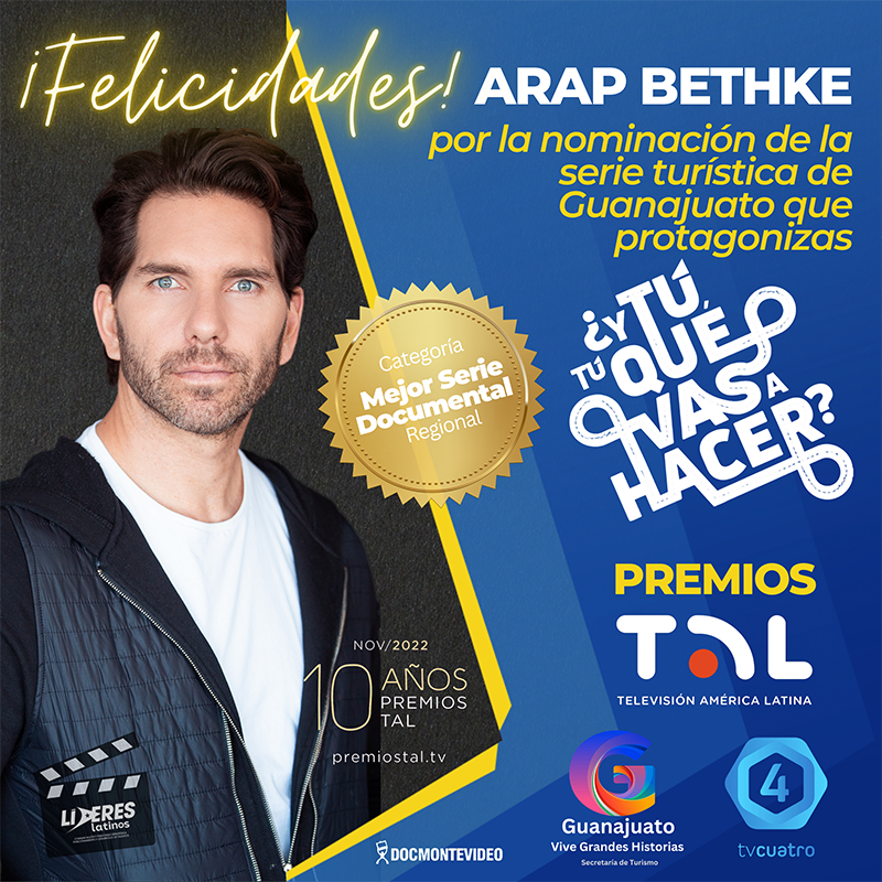 La serie de promoción turística de Guanajuato ¿Y Tú, Tú Qué Vas a Hacer?, protagonizada por el actor Arap Bethke, ha sido nominada ‘Mejor Serie Documental Regional’ en los Premios TAL 2022, la principal premiación que reconoce lo mejor de la televisión pública, educativa y cultural de América Latina.