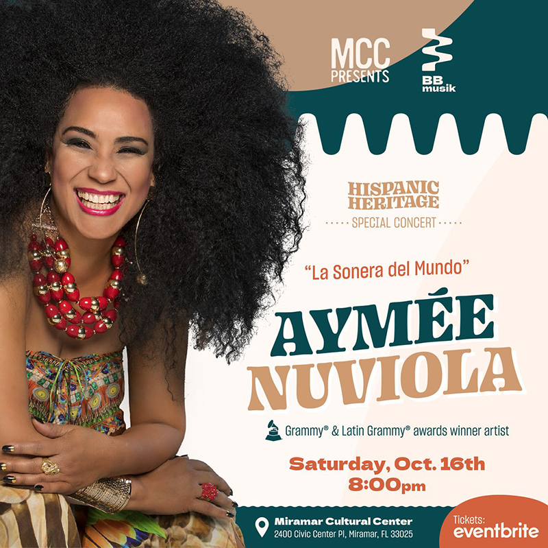 “La sonera del mundo” Aymée Nuviola, se reencuentra con su público de la Florida en el concierto celebrando el mes de la Herencia Hispana este sábado 16 de octubre en el Centro Cultural de Miramar, Arts Park, con la coordinación de bbmusik y Boris Bossio.