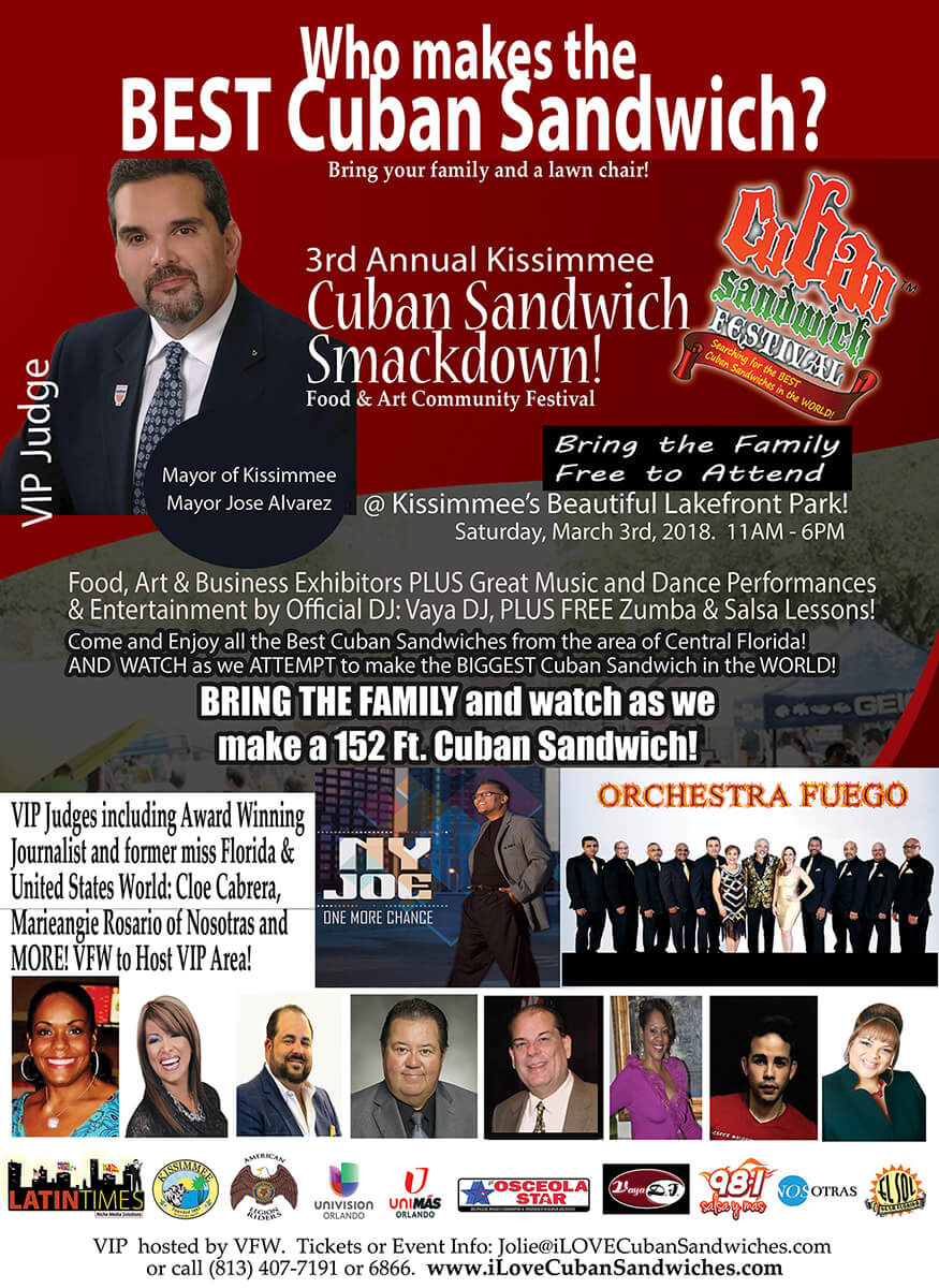 Únase a nosotros para el BIG SMACKDOWN donde restaurantes de toda la Florida Central se unen a nosotros para competir por la posibilidad de representar a la Florida Central y de ganar el título «¡EL MEJOR SÁNDWICH CUBANO EN EL MUNDO!» de 2018.