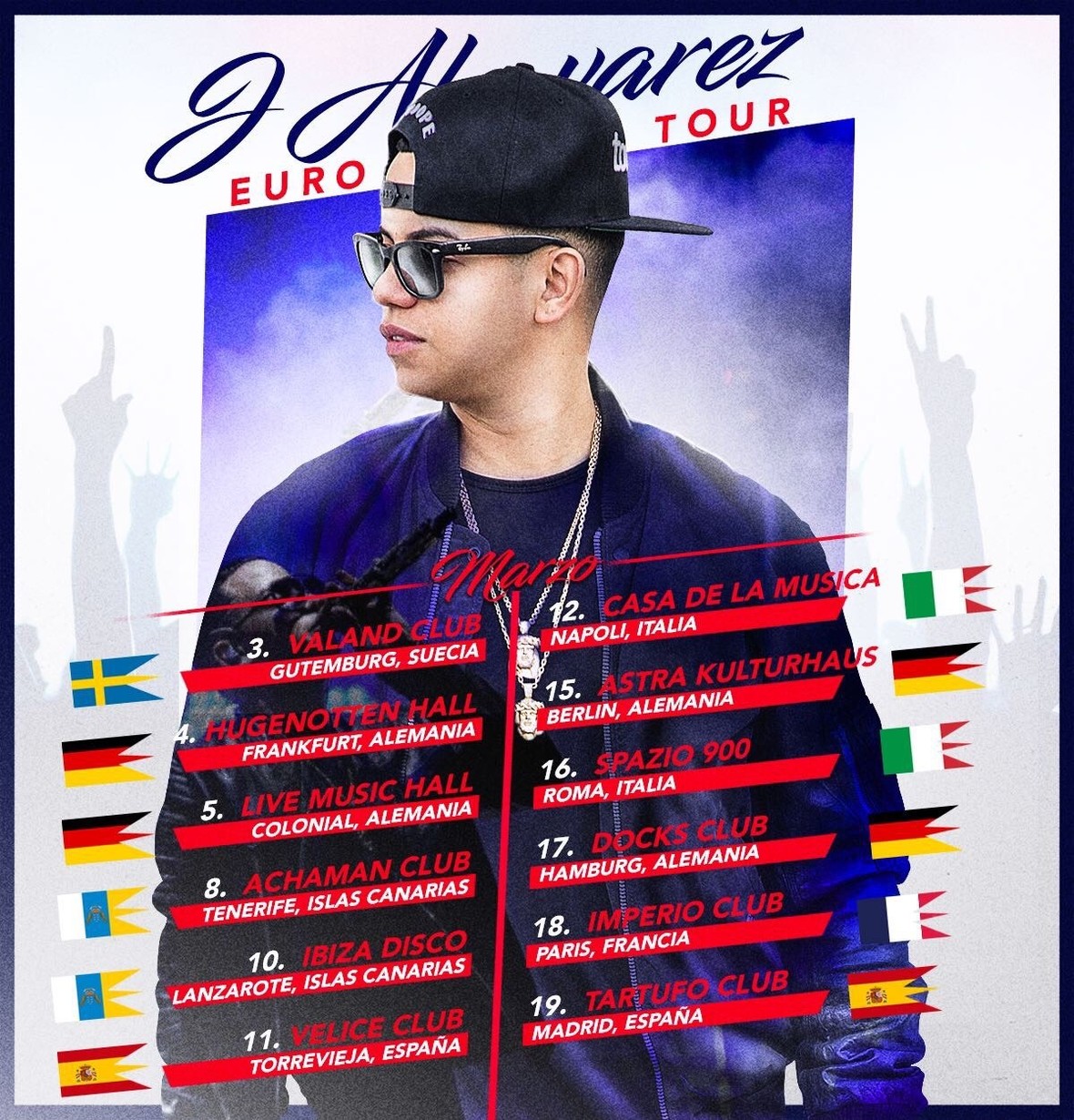Tras un éxito rotundo con sus más recientes lanzamientos ‘Rico Suave’ y ‘HATERS’ Remix, J ÁLVAREZ, uno de los más grandes exponentes de la música urbana, expande su sonido y abarrota los escenarios del continente europeo en una gira única que comenzó en Suecia y finalizará en España tras recorrer más de cinco países.