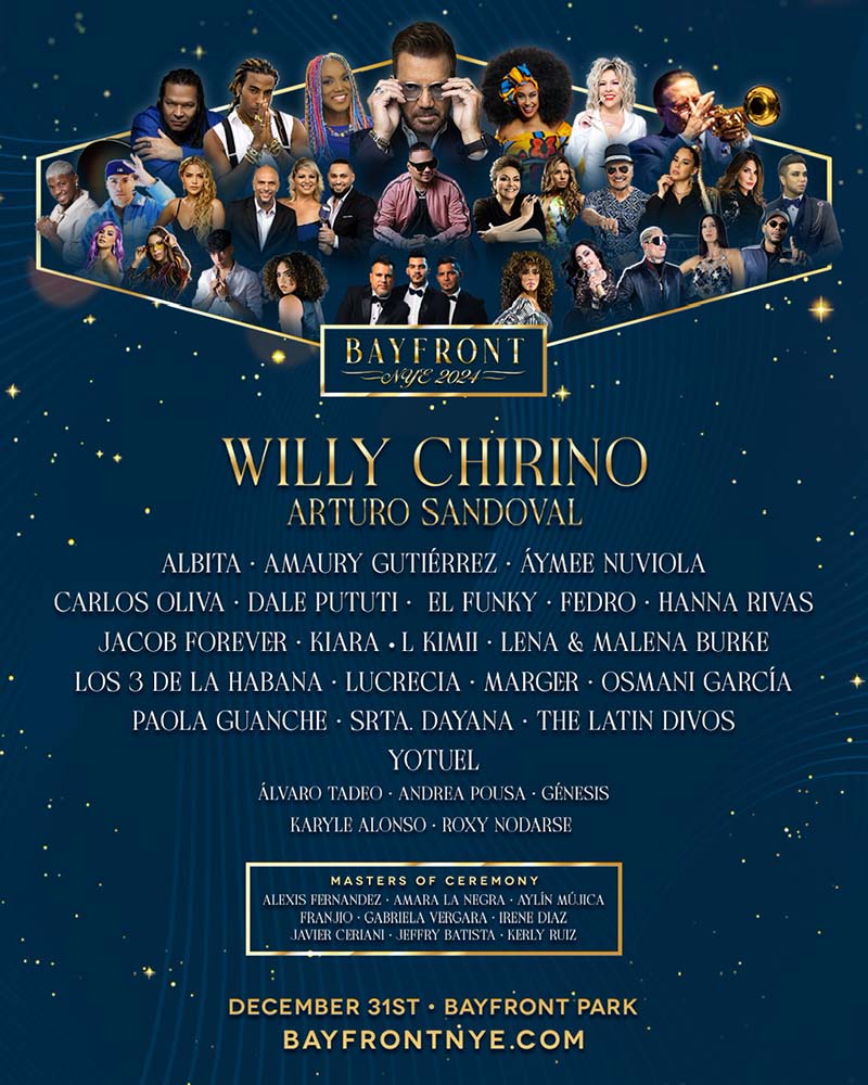 Este año más de 30 artistas subirán al escenario para cantar sus éxitos y terminar el año al más puro estilo Miami. La celebración de Año Nuevo contará con actuaciones principales de artistas con ventas de platino e íconos ganadores de GRAMMY® y Latin GRAMMY®, Willy Chirino y Arturo Sandoval, y acompañados por una impresionante lista de artistas que incluyen a Albita, Álvaro Tadeo, Amaury Gutiérrez, Andrea Pousa, Aymée Nuviola, Carlos Oliva, Dale Pututi, El Funky, Fedro, Génesis, Hanna, Jacob Forever, Karyle Alonso, Kiara, Lena & Malena Burke, Los 3 De La Habana, Lucrecia, Marger, Osmani García, Paola Guanche, Roxy Nodarse, L Kimii, Srta. Se esperan Dayana, The Latin Divos, Willy Soriano y Yotuel, entre otros invitados especiales.