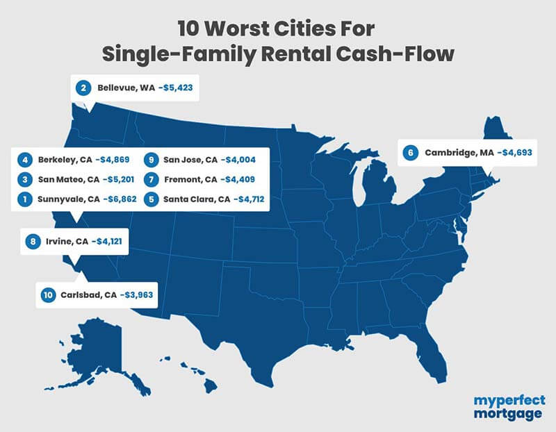 De acuerdo con MyPerfectMortgage.com, el flujo de efectivo mensual potencial en las 10 ciudades principales es: