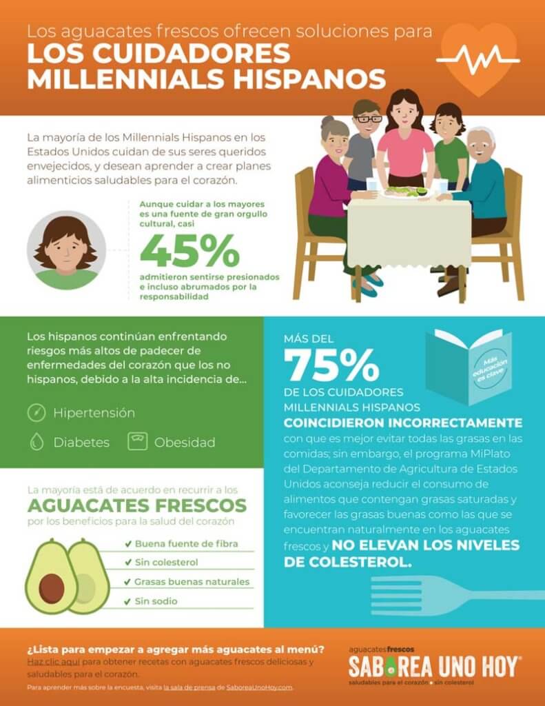 Dado que la mayoría de los millennials hispanos en Estados Unidos (73%) cuidan de sus padres mayores, de sus abuelitos o de otros miembros de su familia, Aguacates Frescos – Saborea Uno Hoy analizó sus conocimientos en cuanto a nutrición para la salud cardiovascular. Los hispanos continúan enfrentando riesgos más altos de padecer de enfermedades del corazón que los no hispanos, debido a la alta incidencia de hipertensión, obesidad y diabetes.i Como los cuidadores comúnmente son responsables de comprar los comestibles y preparar alimentos, tienen una oportunidad importante de ayudar a reducir los factores de riesgo que sus seres queridos enfrentan a través de la educación y cambios en estilos de vida, incluyendo el tener a la mano más alimentos saludables para el corazón, como los aguacates frescos.