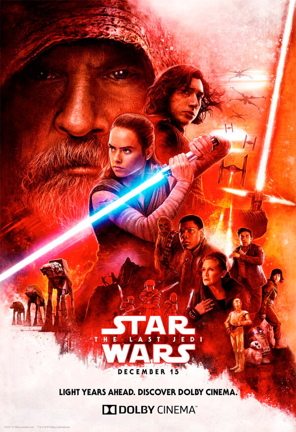 Star Wars: Los últimos Jedi se estrena el 15 de diciembre en los cines y la página oficial en Facebook de las películas de la saga acaba de compartir un nuevo póster exclusivo de Dolby Cinema. Ya queda menos de un mes para que llegue a las pantallas el Episodio VIII de La Guerra de las Galaxias escrito y dirigido por Rian Johnson y Luz y Oscuridad protagonizan este último cartel con Rey (Daisy Ridley) y Kylo Ren (Adam Driver) en primer plano y la mirada atenta del maestro Luke Skywalker (Mark Hamill) de fondo.