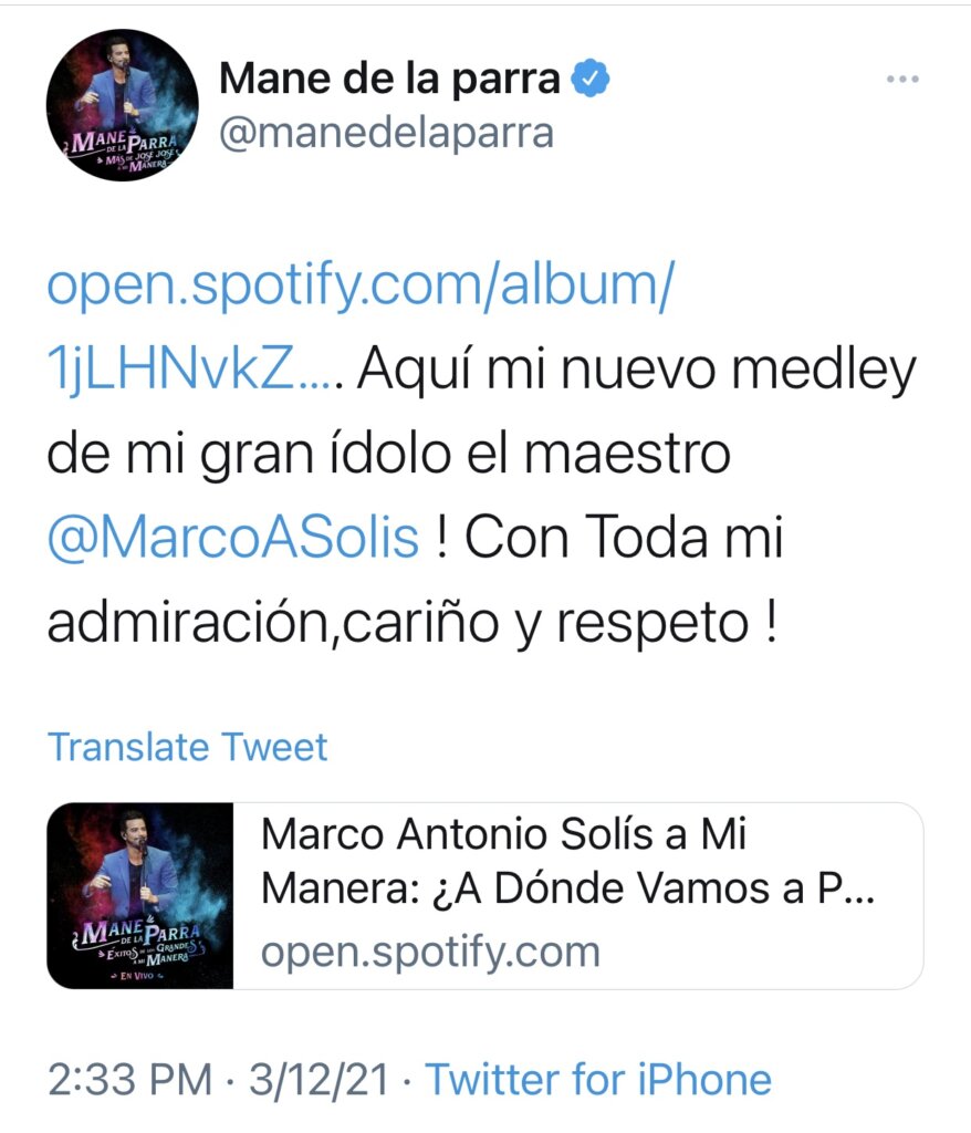 Muchos han felicitado al cantante mexicano Mane de la Parra por la serie de acústicos virtuales que está realizando «Desde Casa», pero uno muy especial fue el mensaje de Marco Antonio Solís quien lo felicitó por el tributo que le dedicó en el concierto «Éxitos de los Grandes a mi Manera» cantando medley de sus temas, los cuales subió en su canal de YouTube y en varias plataformas musicales como Spotify.