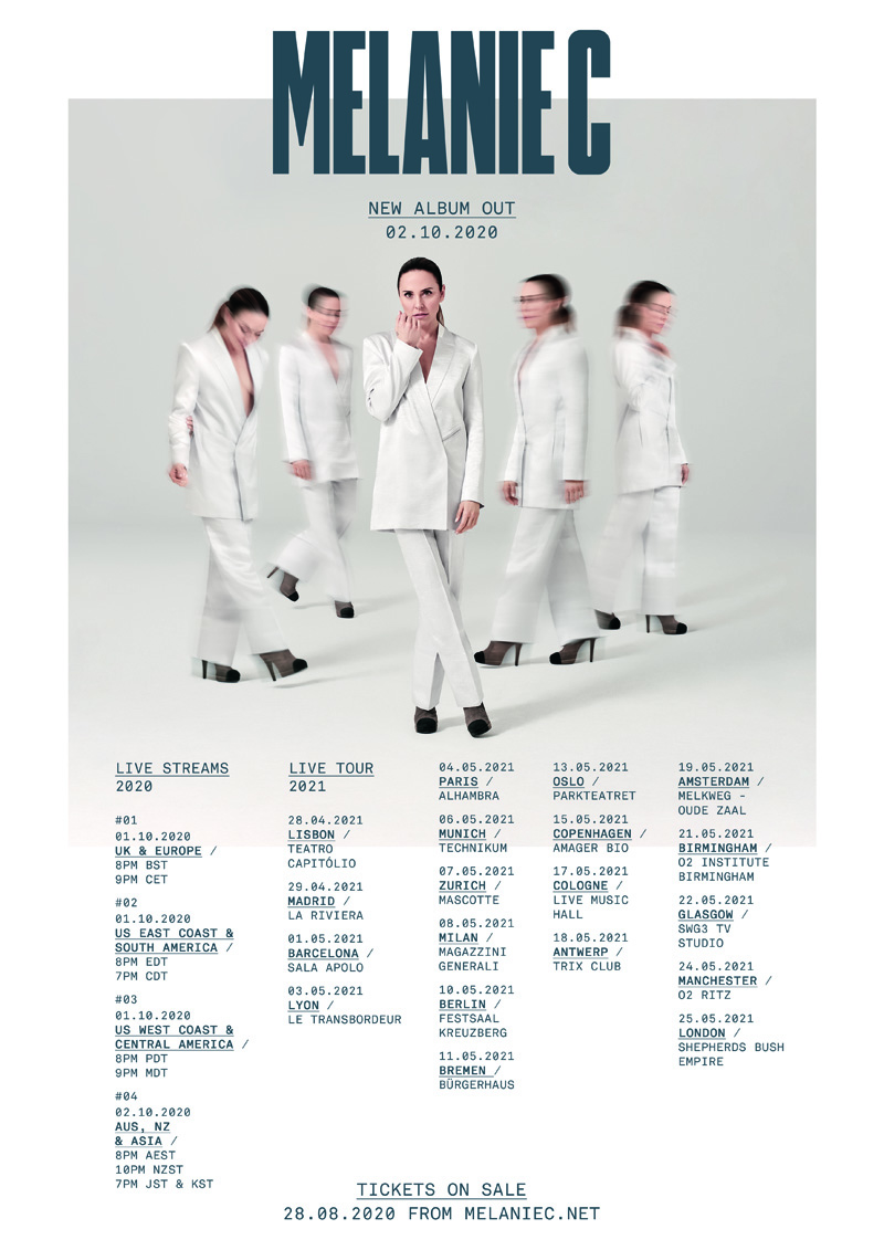 Melanie C ha anunciado hoy los detalles de una gira por el Reino Unido y Europa para la primavera de 2021 que hará parada en Madrid el 29 de abril en La Riviera y el 1 de mayo en la sala Apolo de Barcelona. También ha confirmado cuatro conciertos en directo por streaming que coincidirán con el lanzamiento de su tan esperado álbum homónimo el 2 de octubre (con un set de banda completa y muchas sorpresas por revelar). La pre-venta para sus conciertos en 2021 comienza el 26 de agosto a las 10AM y la salida a venta general el 28 de agosto. Las entradas para las transmisiones en vivo también están disponibles a través de su sitio web oficial: https://melaniec.net/.