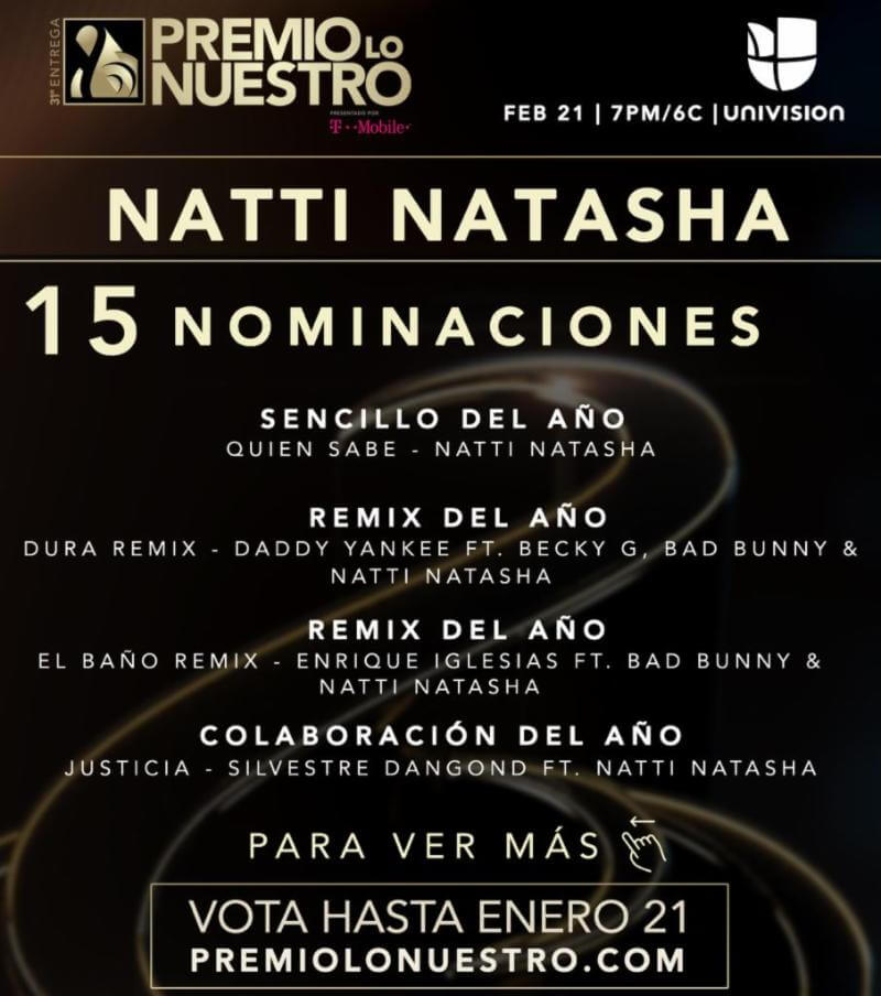 La “Reina de las Vistas” recibió 15 nominaciones en las categorías; «Sencillo del Año» por «Quien Sabe», «Remix del Año» por «Dura Remix» con Daddy Yankee ft. Becky G., Bad Bunny y Natti Natasha», «Remix del Año» por «El Baño Remix» con Enrique Iglesias ft. Bad Bunny y Natti Natasha, «Colaboración del Año» por «Justicia» con Silvestre Dangond entre otros.