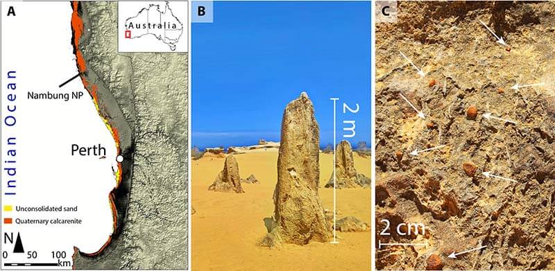 Mapa de la localidad de los pináculos del Parque Nacional Nambung, que incluye la distribución de calcarenita cuaternaria y arena no consolidada del Holoceno (A) [basado en Geoscience Australia a escala 1:1.000.000, Geología de Superficie de Australia (conjunto de datos digitales, 2008); modelo digital de elevación descargado del sitio web de la Misión Topográfica Shuttle Radar]. Fotografía de los pináculos y la secuencia estratigráfica del Parque Nacional Nambung (B). Un conjunto de nódulos de ferricreta cementados en los márgenes de los pináculos (las flechas señalan los nódulos) (C).
