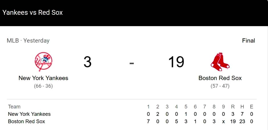 Fue quizás la peor apertura de un lanzador de los Yankees ante los Medias Rojas: el japonés Masahiro Tanaka (7-6) toleró 12 carreras, con 12 hits, 3 boletos y 4 ponches en 3 1/3 entradas.