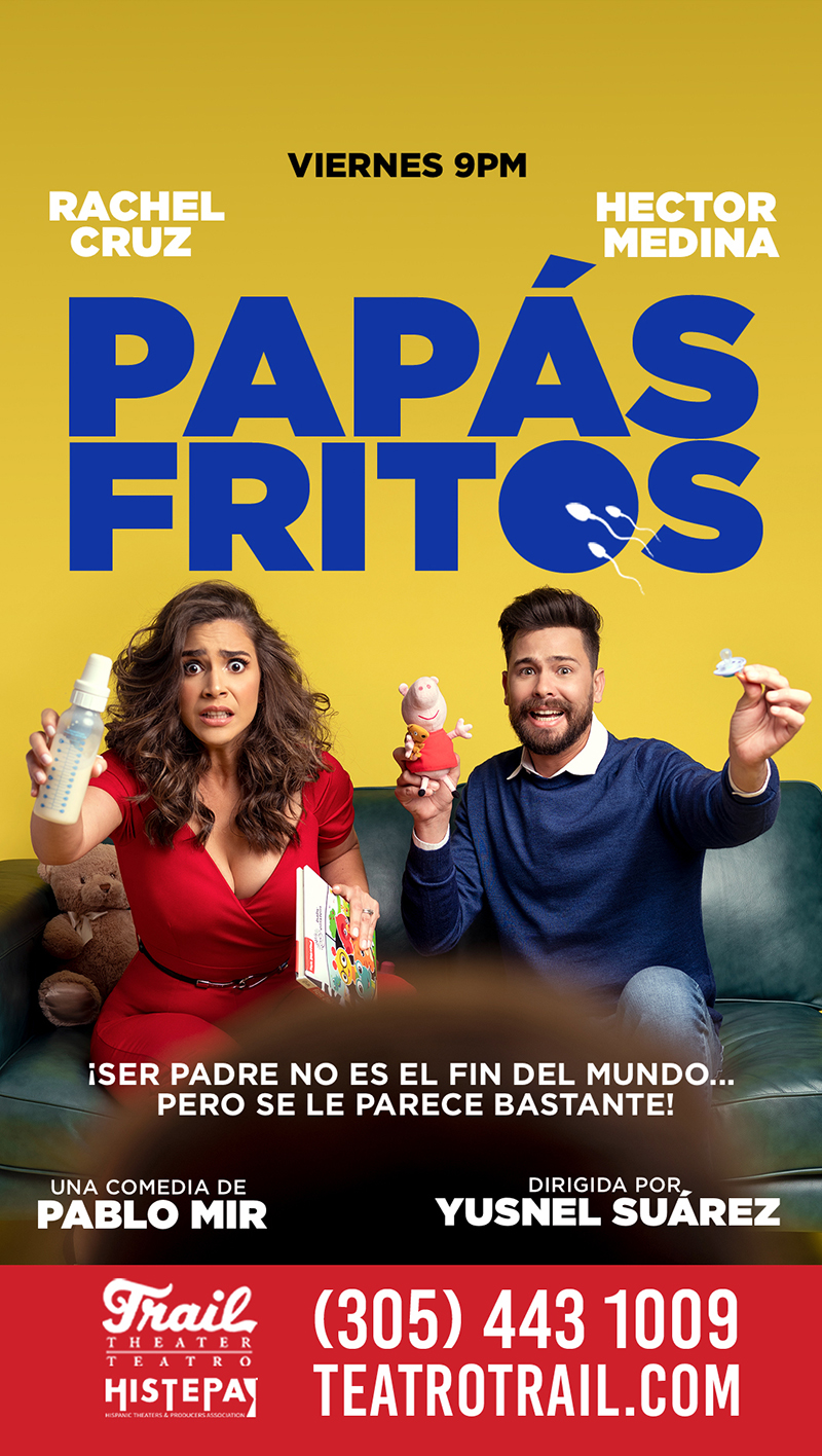 La cita es cada viernes a las 9pm en el Teatro Trail, la obra es «Papás Fritos», una comedia inigualable, con los actores Rachel Cruz y Hector Medina. Esta obra maestra es una comedia de Pablo Mir, dirigida por Yusnel Suarez de OMG Studios Miami, y cuenta la historia de Valeria y Diego, una pareja que están esperando los resultados de una prueba de embarazo. Entre muchas risas y emociones, iran representando como seria su vida si llegan a tener un hijo, descubrirán que ser padres no es el fin del mundo, pero es bastante parecido.