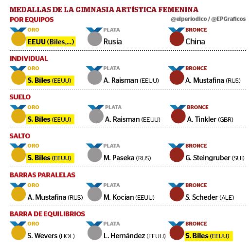 Se le ha comparado con Michael Jordan por su capacidad para hacer olvidar que las leyes de la gravedad existen; a Michael Phelps por la perfecta adecuación de su cuerpo a su deporte, y a Serena Williams por el dominio casi absoluto en su disciplina. Pero la estadounidense de 19 años que ha roto estereotipos, ha revolucionado la gimnasia y en Río ha confirmado su grandeza con cuatro medallas de oro, incluyendo la que corona como mejor gimnasta, y una de bronce no quiere ser medida en comparación con nadie. “No soy la nueva Usain Bolt o la nueva Michael Phelps”, decía hace unos días. “Soy la primera Simone Biles”. Primera y única.