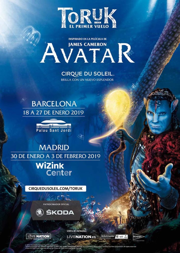 El nuevo espectáculo itinerante del Cirque du Soleil inspirado en AVATAR, la película de James Cameron que batió todos los récords, TORUK – El primer vuelo, se presentará en el Palau Sant Jordi de Barcelona del 18 al 27 de enero del 2019 y en el Wizink Center de Madrid del 30 de enero al 3 de febrero de 2019.