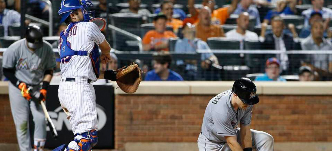 Luego de que Jay Bruce fuera dominado con un batazo al jardín derecho, Travis d’Arnaud recibió el boleto para llenar las almohadillas y enfrentar a Kelly Johnson, quien con un doblete a la pradera derecha limpió las bases ante unos Marlins que cerraron el mes con su peor marca de la contienda (10-18).