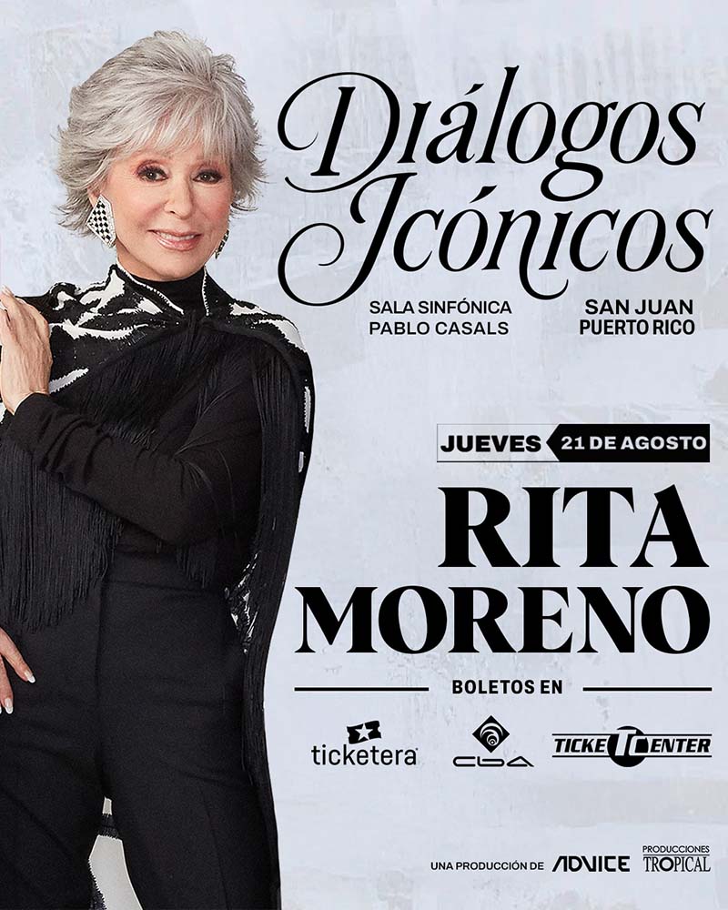 La legendaria artista Rita Moreno inaugura la primera edición de DIÁLOGOS ICÓNICOS, a llevarse a cabo el jueves, 21 de agosto de 2025 a las 7:30pm en la Sala Sinfónica Pablo Casals del Centro de Bellas Artes Luis A. Ferré, en San Juan. Los boletos para el evento están disponibles a través de Ticketera, Ticket Center y la boletería del Centro de Bellas Artes Luis A. Ferré.